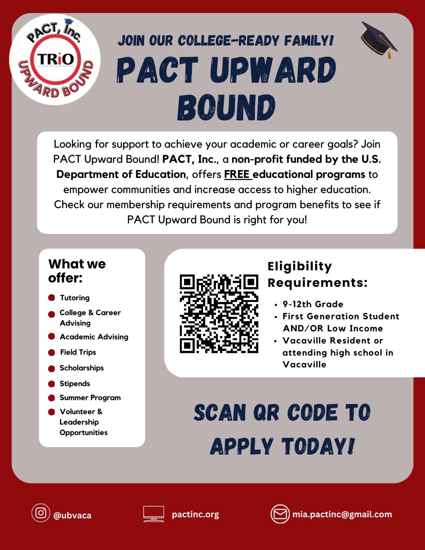 Vacaville Upward Bound The Upward Bound program offers:Tutoring, and college and career readiness, including: Core subject tutoring and homework help College exploration (UC, CSU, community college, private, vocational…) and application assistance Major, career, internship options and pathways Grade-level timelines and checklists Financial aid options/FAFSA/scholarship timeline, and application assistance SAT/ACT information, registration assistance, and fee waivers UC Personal Insight Questions (PIQs) overview and review Common App private school application assistance and personal statements Educational Opportunity Program (EOP) overview and application assistance for CSUs Transcript reviews Resume building and interview tips Academic Advising (class recommendations for next year) College tours and enrichment activities Student Stipends Summer Programming (6-8 weeks) Click here for the Vacaville UB FlyerClick here to meet the Vacaville UB Team School Sites* Ernest Kimme High School Vacaville High School Will C Wood High School *Students attending middle or high schools not mentioned above and located in Solano Counties, may be considered. apply today